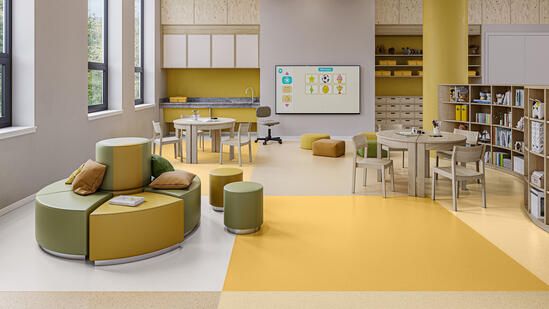 Primo Premium is part of Tarkett’s Premium Range, a homogenous vinyl flooring solution designed for schools, public buildings, healthcare facilities and care homes that nurture and protect us throughout our lives. The Premium Range’s palette of 86 colours across Eclipse Premium and Primo Premium is a feast for the eyes, where joyful hues enliven the senses and subtle tones whisper harmony and peace. Primo Premium, in its spectrum of 30 easy-to-combine shades, uses neutral-coloured accents, ideal for high-traffic areas. Each design is infused with non-directional patterns so you can skillfully guide the emotional temperature and functionality of each space — whatever its use.